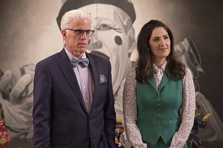 And like the series’ architect of lunacy trying to top himself, Amram and Goddard keep taking their themes even further as the episode progresses. Around attempt #802, the chess pieces that Michael keeps moving around go on strike. They’re tired of Michael playing God and failing. Eleanor and Chidi venture to the outskirts of the show’s world where they re-encounter Mindy St. Claire (Maribeth Monroe), the only soul ever sent to purgatory, a.k.a. “The Medium Place.” She has no major role in Michael’s grand experiment; she just wants her visitors to remember for once to bring her some cocaine, unlike the last 15 times they were there. The woman is just trapped watching bad Eighties movies and hoping someone knocks on her door with drugs. She may really be in the baddest place of all.