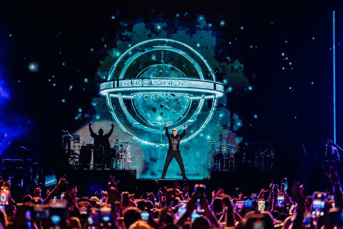 Midway through, Pitbull shed his jacket for a white blazer and steered the show into a Latin-dance medley — congas, brass, and all. He flirted in Spanish, teased the crowd with snippets of “Gasolina,” and slipped into Bon Jovi’s “Livin’ on a Prayer” before launching into “Feel This Moment.” His stamina was staggering, his charisma undimmed.