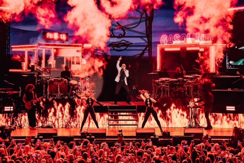 Midway through, Pitbull shed his jacket for a white blazer and steered the show into a Latin-dance medley — congas, brass, and all. He flirted in Spanish, teased the crowd with snippets of “Gasolina,” and slipped into Bon Jovi’s “Livin’ on a Prayer” before launching into “Feel This Moment.” His stamina was staggering, his charisma undimmed.
