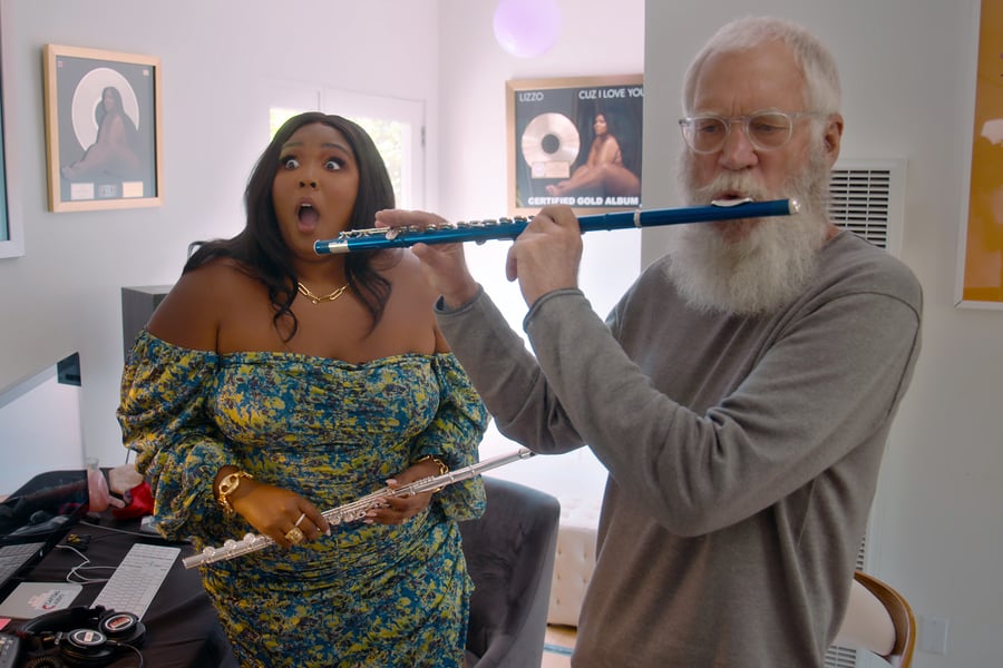 Once Letterman and Lizzo sat down together, though, they instantly eased into a thorough conversation on her rise to fame, covering everything from her upbringing in Detroit and Houston to her early music career in Minneapolis (including a mentorship from Prince) to her eventual star turn with “Truth Hurts.” In cutaway segments throughout the episode, Lizzo took Letterman on a tour of her house and home studio, showcasing her flute and crystal collections and even helping him lay down a demo track.