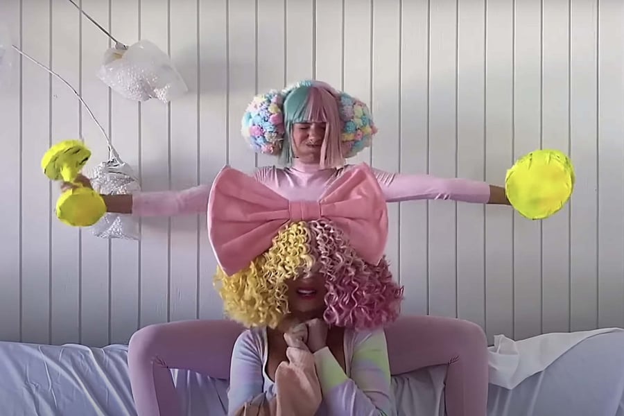 Wearing a bright yellow-and-pink curly wig with a huge pink bow, Sia sang “Together” on her living room couch as Ziegler, in a pink leotard, matched the high energy of the pop track with all sorts of dance moves and antics: tossing clothes around the room, giving Sia a bubble scrub bath, throwing a stack of pancakes at the camera and wheeling out a giant Connect Four board game. At the end of the clip, Sia and Ziegler collapsed on the couch, with Sia proclaiming, “I love you, Jimmy!”