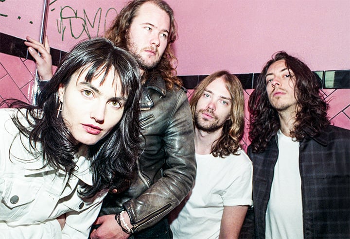 She stands out in a crowd. Even here, in hip Surry Hills. There she is, Izzi Manfredi of the Preatures, striding across the street, lanky, grinning and fashionably late, wearing red velvet flares and silver pointy boots, a black turtleneck, a black wool jacket with red racing stripes down the sleeves and Nancy Sinatra-style white-rimmed sunglasses perched on top of jet black hair. She leads the way into a back stairwell, up a couple of flights of stairs surrounded by wall-to-wall graffiti and we enter Doldrums, the band’s scruffily inviting recording studio in arty enclave Hibernian House.