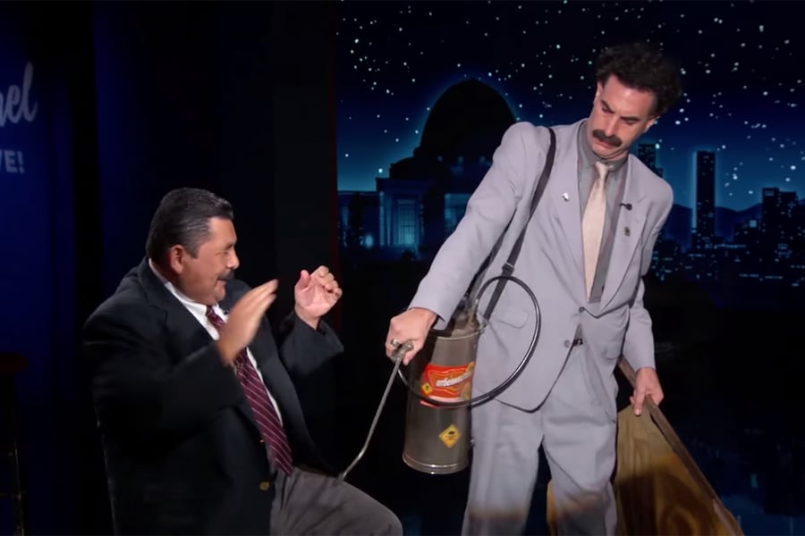 Sacha Baron Cohen appeared as Borat on Jimmy Kimmel Live Monday, October 19th, and tried to force host Jimmy Kimmel to undergo a hilariously invasive and scientifically dubious Covid-19 test.